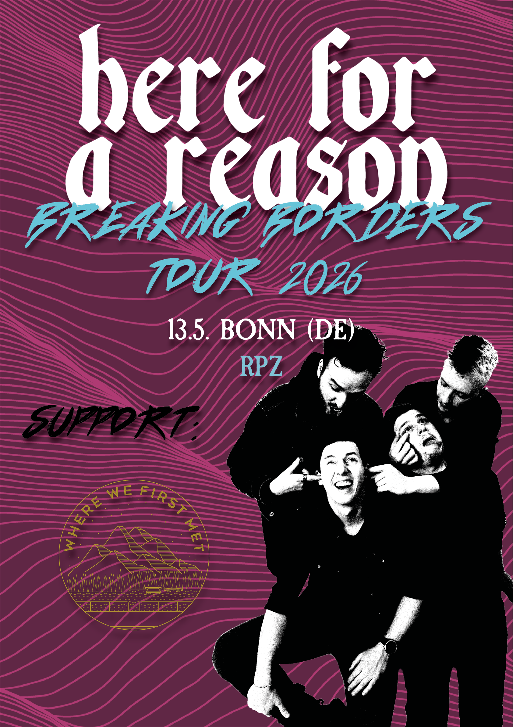 Im Rahmen ihrer „Breaking Borders“-Tour machen Here For A Reason Station im RPZ und bringen frischen Pop-Punk-Sound aus Wien nach Bonn. Die Band steht für eingängige Melodien, druckvolle Gitarren und ehrliche Texte. Eine Mischung, die live besonders intensiv zur Geltung kommt.